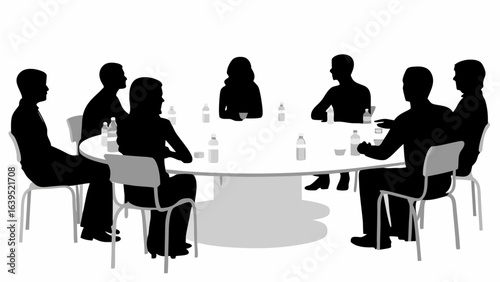 Silhouette illustration of people sitting around a round table with water bottles and small dishes, meeting | editable eps vectors