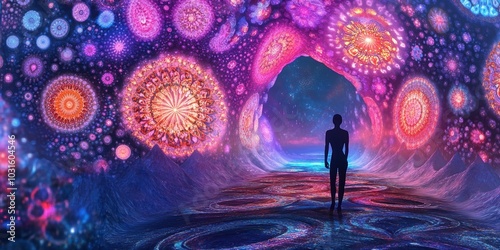 Silhouette in a glowing, cosmic cave.