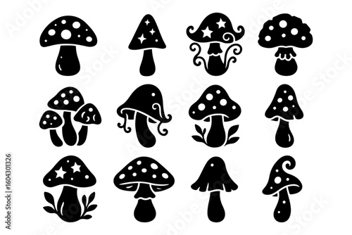 Silhouette magic mushrooms collection in black and white with unique patterns