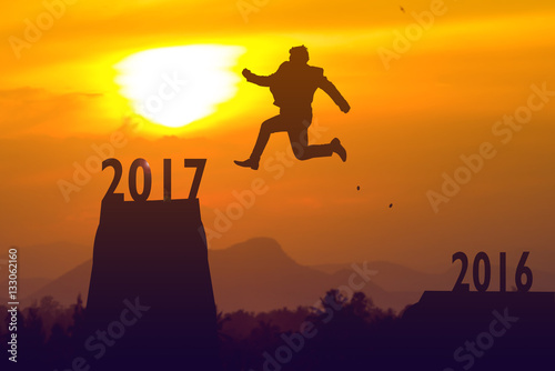 silhouette Man Jumping to 2017 in sun rise.