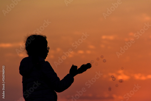 silhouette of a african little girl blowing soap bubbles and her little brother running after bubbles with joy, happiness, laughter and fun on beach at sunset, blowing soap bubbles outdoor in Algeria.