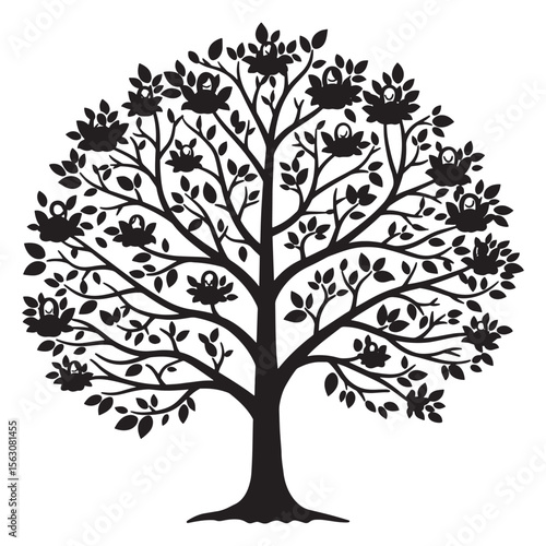 Silhouette of a beautiful tree with detailed foliage and decorative lotus flowers