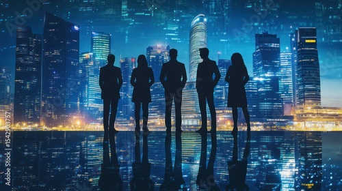 Silhouette of a Business Team Standing Before a Futuristic Cityscape View