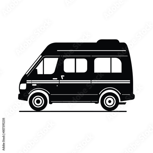 Silhouette of a camper van illustration in black and white.