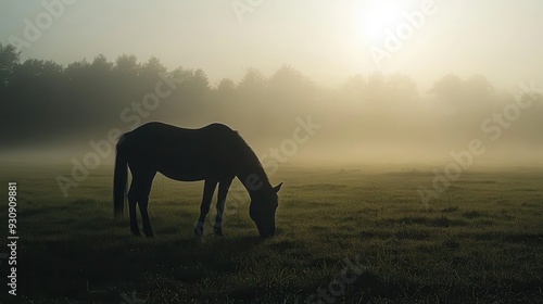 Silhouette of a Horse Grazing in a Misty Field at Sunrise