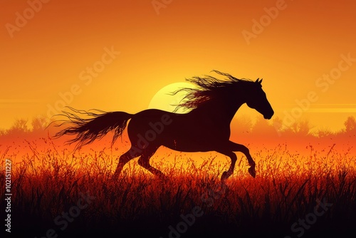 Silhouette of a Horse Running Through Tall Grass at Sunset