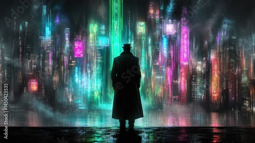 Silhouette of a man gazing at a vibrant futuristic city