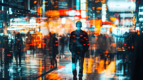 Silhouette of a Man Reflected in a City Window with Blurry Lights