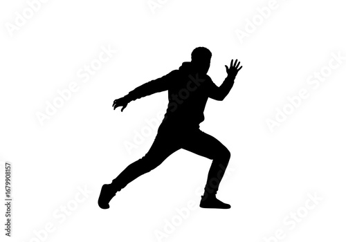 Silhouette of a man running in motion, captured in a stark black and white image against a clean background