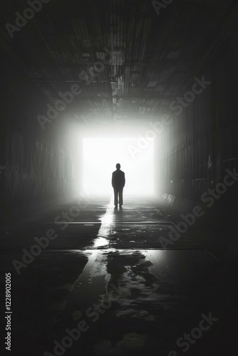 Silhouette of a man standing in a tunnel, light at the end of the tunnel, symbolic image for near-death experience, death, psychology, threat, danger, fear, trauma, parapsychology, AI generated, AI generated, AI generated