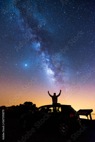 Silhouette of a man with his arms raised looking at the stars and the Milky Way on a summer night in the sky of Tenerife