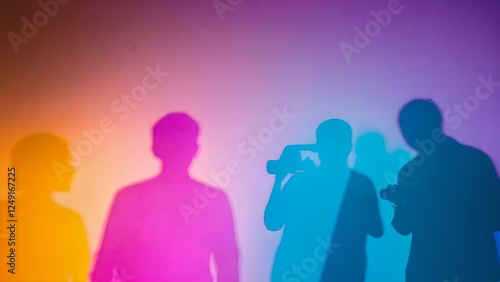 Silhouette of a person filming with camcorder against colorful artistic light and shadow display on wall