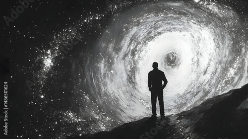 Silhouette of a person gazing at a swirling galaxy in a dark space.
