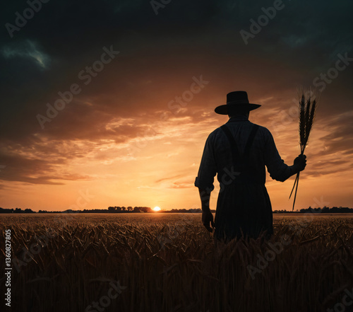 Silhouette of a person standing in a wheat field during sunset wearing a hat and holding a few stalks of wheat. Dramatic sky with clouds and a glowing horizon, creating a serene pastoral atmosphere.
