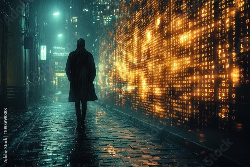 Silhouette of a Person Walking Down a Wet Alleyway at Night with a Digital Wall in the Background