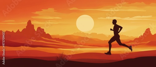 Silhouette of a Runner at Sunset in a Desert Landscape with Mountains and a Vibrant Orange Sky