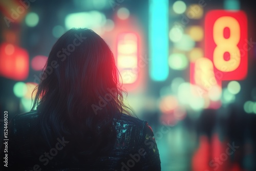 Silhouette of a woman with long hair standing in front of blurry neon signs in an urban night scene