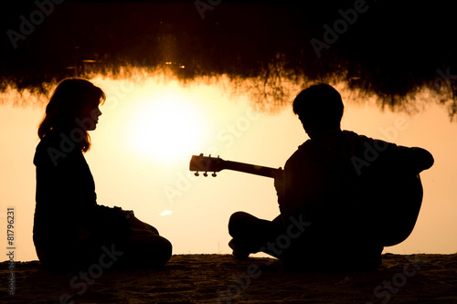 silhouette of a young boy and girl on the beach with a guitar