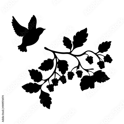 Silhouette of bird flying near branch with leaves and berries vector illustration design element for art 100