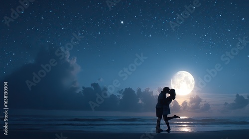 Silhouette of couple hugging and kissing on beach at night, man lifting woman’s leg, huge bright full moon in deep blue starry sky, romantic atmosphere, Mid-Autumn Festival scene