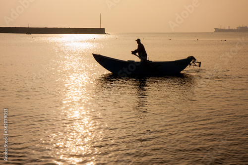 silhouette of man rowing fishing boat in water during dusk and golden hour in Lima Peru