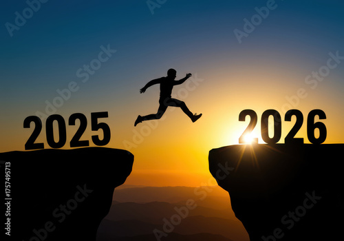 Silhouette of person jumping from 2025 cliff to 2026 during sunset symbolizing new year transition