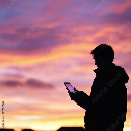 Silhouette of Person Using Smartphone Against a Vibrant Sunset