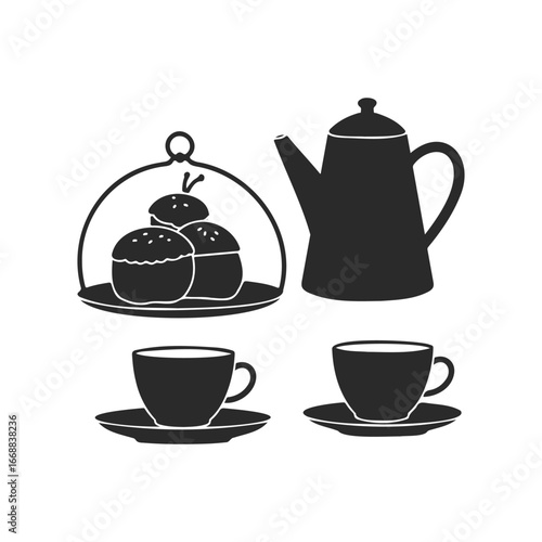 Silhouette of teapot, cups, and pastries on tray