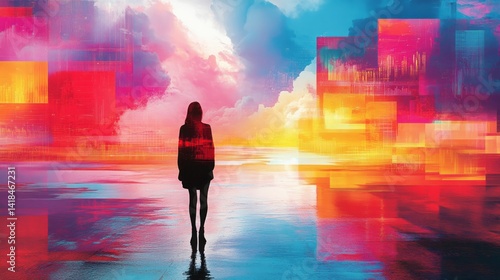 Silhouette of woman gazing into vibrant cityscape landscape art