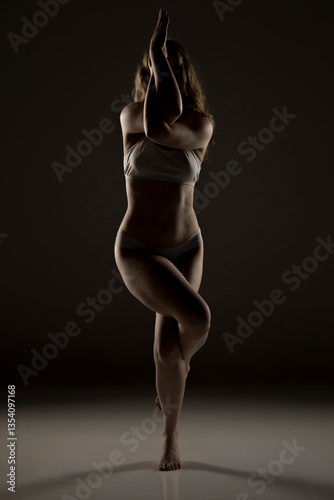 Silhouette of woman in white underwear performing yoga eagle arms pose (Garudasana), showcasing form and concentration against dark background with rim lighting.