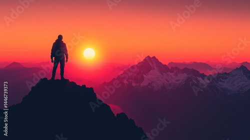 Silhouette person sunrise mountain top view