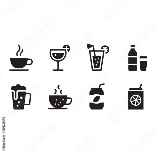 Silhouette Style Beverage Icons Set Vector Illustration. Diverse Drink Pictograms for Menu Design and Cafe Branding Projects.