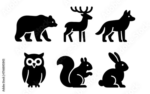 Silhouette wildlife icons: bear, deer, wolf, owl, squirrel, rabbit