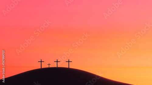Silhouetted crosses on a hill against a vibrant sunset sky.