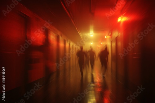 Silhouetted figures run down a hazy, red-lit corridor, urgency echoing in their motion. The scene pulses with tension, mystery, and cinematic suspense under dim, moody light. Jail escape concept