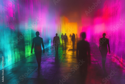 Silhouetted figures walk through a vibrant neon-lit corridor, casting shadows against the colorful spectrum of purple, pink, and yellow hues.