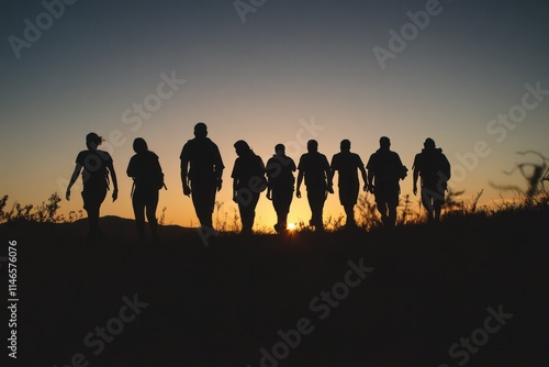 Silhouetted Group of People Walking into the Sunset Over a Desert Landscape, Symbolizing Connection, Adventure, and Unity in Nature's Beauty