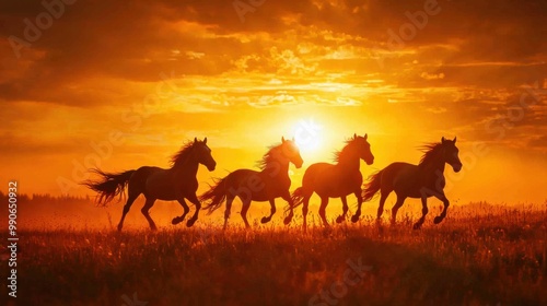 Silhouetted Horses Galloping at Dramatic Sunset in Expansive Meadow Landscape