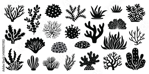 Silhouetted Seaweed and Coral Variety a Monochrome Aquatic Botanical Illustration Set Perfect for Nautical Themed Decorations and Educational Materials