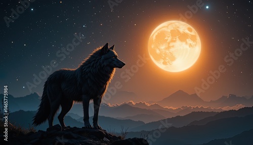 Silhouetted wolf gazes at a luminous moonlit mountain range.