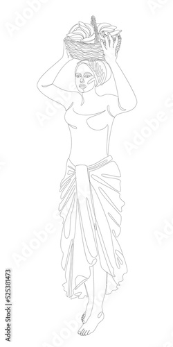 Silhouettes of a girl in a headscarf. The lady is holding a basket of bananas in her hands. Woman in modern one line style. Solid line, decor outline, posters, stickers, logo. vector illustration.