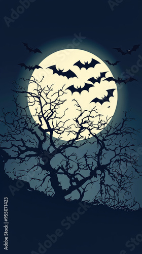 Silhouettes of Bats Dancing Around a Full Moon in a Dark, Eerie Night Sky