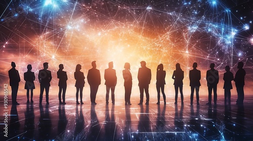 Silhouettes of Business People Standing Before Abstract Network Background.