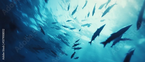 Silhouettes of fish swim gracefully in the ethereal, blue-lit depths of the ocean, capturing the mysterious beauty of underwater life.