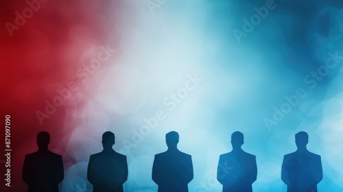 Silhouettes of five people standing in front of a vibrant background blending red and blue hues, symbolizing unity and diversity.