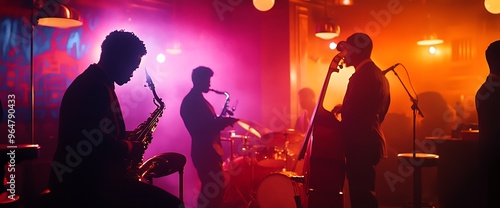 Silhouettes of musicians performing on stage in a dimly lit club.