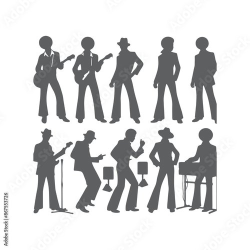 Silhouettes of three retro dancing man, funk, soul and disco music - 60s, 70s style, Posing disco dancers isolated on white background. Hetero couple in party 1970s style clothing.
