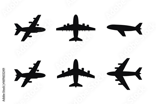 Silhouettes of various airplanes in flight against a dark background, illustrating aviation and travel themes.