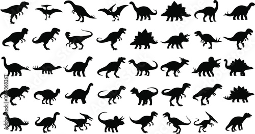 Silhouettes of various dinosaurs in dynamic poses, including T-Rex, Stegosaurus, Triceratops, Brachiosaurus, and Pterodactyl, black isolated icons on white background