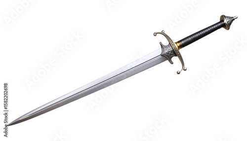 Silver sword or rapier with a long, narrow blade and detailed hilt design, isolated on a white background PNG